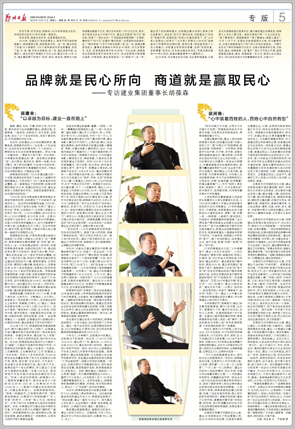 2019年,在建業27年的發展史上,具有不同凡響的特殊意義,特別值得記取,特別值得書寫。這一年,建業完成了全省18個省轄市、105個縣和縣級市的全面覆蓋,實現了省、市、縣、鎮、村的五級聯動;這一年,建業成果豐碩,業績驕人,繼去年資產規模達千億元之后,截至今年12月12日,建業集團旗下的地產、投資、筑友、新生活、教育五大板塊銷售金額逾千億元,預計全年實現1150億元左右,其中,地產板塊正在全力沖刺千億元,建業正式躋身“雙千億”俱樂部,創造了一家企業在一個內陸省份持續深耕一大領域,最終創下“雙千億”業績的“模式奇跡”,在我國的內陸省份,這一“模式奇跡”幾乎不可能出現第二家;這一年,是建業集團創始人、董事長胡葆森大學畢業40周年,作為全程參與、見證、投身我國改革開放40年的一代企業家,胡葆森言必稱感恩改革開放的偉大時代,言必稱感恩河南城鎮化進程,河南老胡、建業老胡自成一大“超級IP”;這一年,建業創下的品牌制高點,亦即建業最大的核心競爭力和社會影響力,卻遠非“雙千億”數字本身,而是建業27年間在“根植中原,造福百姓”的核心價值觀驅動下,在“讓河南人民都住上好房子”“讓河南人民都過上好生活”戰略驅動下所厚積的品牌價值、信用價值,特別是老胡個人的人格魅力,亦即建業和老胡的商謄,這種“創造財富,收獲尊重”的成功,并非商業模式的成功,而是品牌的真諦——民心所向,商道的最高境界——贏取民心。